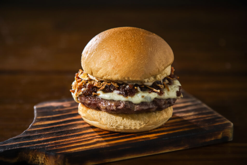 Hambúrguer bovino 200g (blend da casa contém bacon) ponto da casa, com nosso delicioso creme de gorgonzola feito na casa, crispy de bacon caramelado, crispy de cebola e pasta de alho defumada no pãozinho brioche tostado na manteiga.