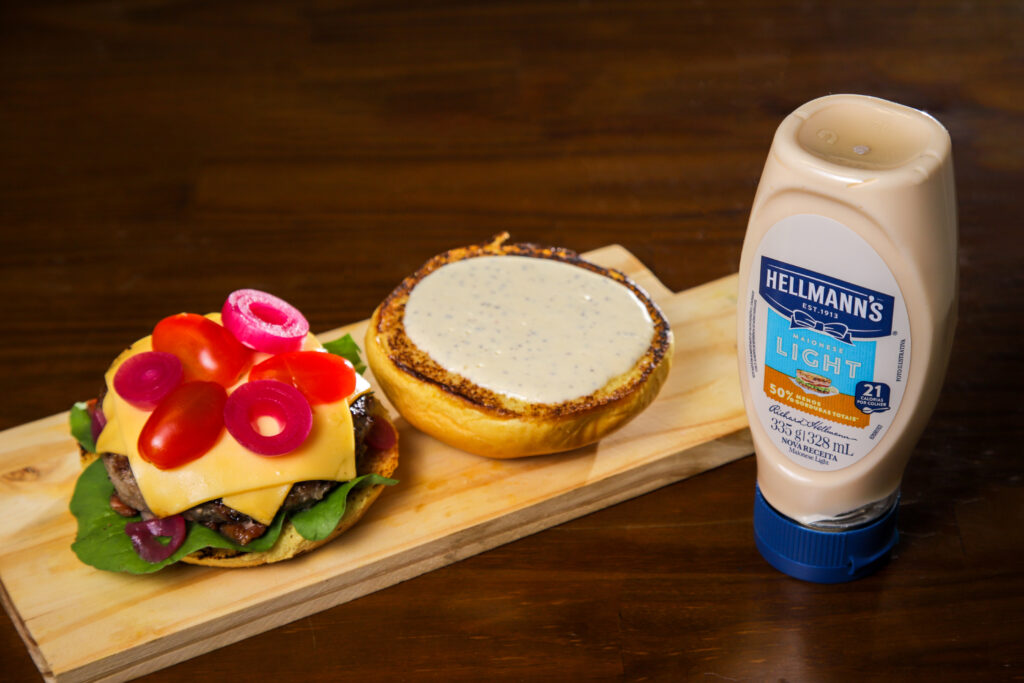 Pão brioche selado na manteiga, hambúrguer artesanal de 150 gramas, queijo prato, rúcula, tomate cereja, picles de cebola roxa e maionese de maracujá .