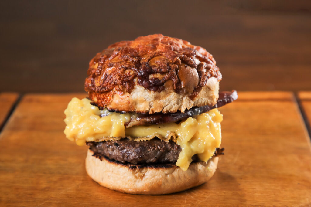 Pão de rapadura , burger bovino de 160g, queijo do sertão e geleia de caju