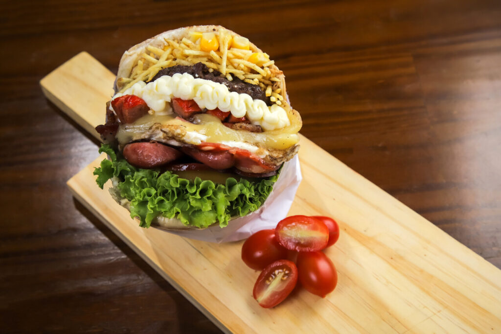 Ingredientes do nosso X-TUBRESO: Pão, hambúrguer artesanal 100 gr, presunto, mussarela, calabresa, bacon, ovo, salsicha, catupiry, alface, tomate, milho e batata palha.