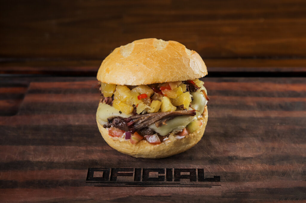 Pão francês chapeado na manteiga, suculento hambúrguer bovino de 150 gramas grelhado, cupim defumado desfiado , geleia artesanal de abacaxi com pimenta, vinagrete e nossa maionese de alho e especiarias .