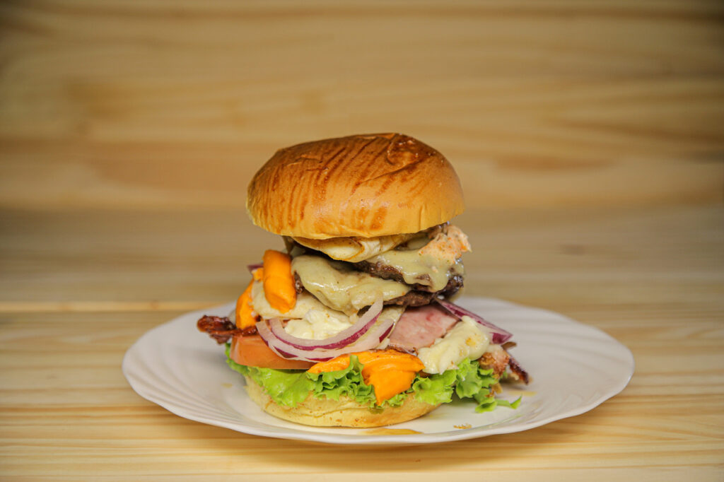 Pão gumer 3 hambúrguer queijo bacon molho especial alface tomate cebola