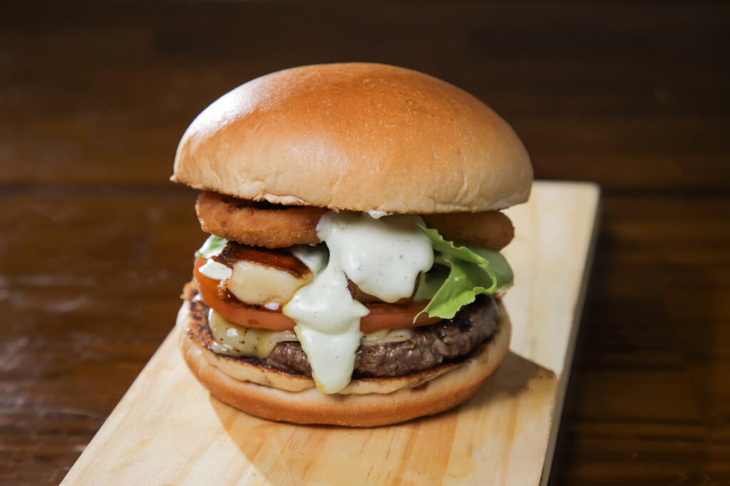 O nosso sanduíche é composto por pão, hambúguer, uma fatia de queijo muçarela, queijo coalho, melado de cana, anéis de cebola, alface, tomate e molho ervas.