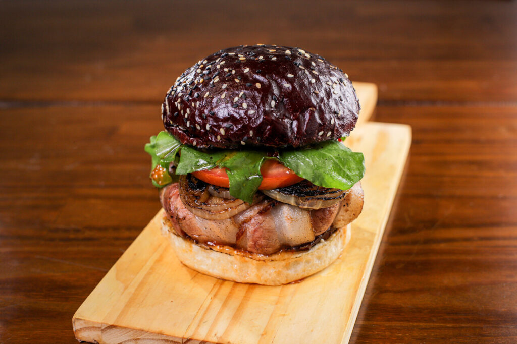Pao premium, hamburger bovino 180gr recheado com queijo cheddar envolto em trama de bacon defumado em pitsmoker por 40 minutos, rodela de cebola chapeada, tomate fresco e rúcula, finalizado com molho sweet chilli da casa levemente picante.
