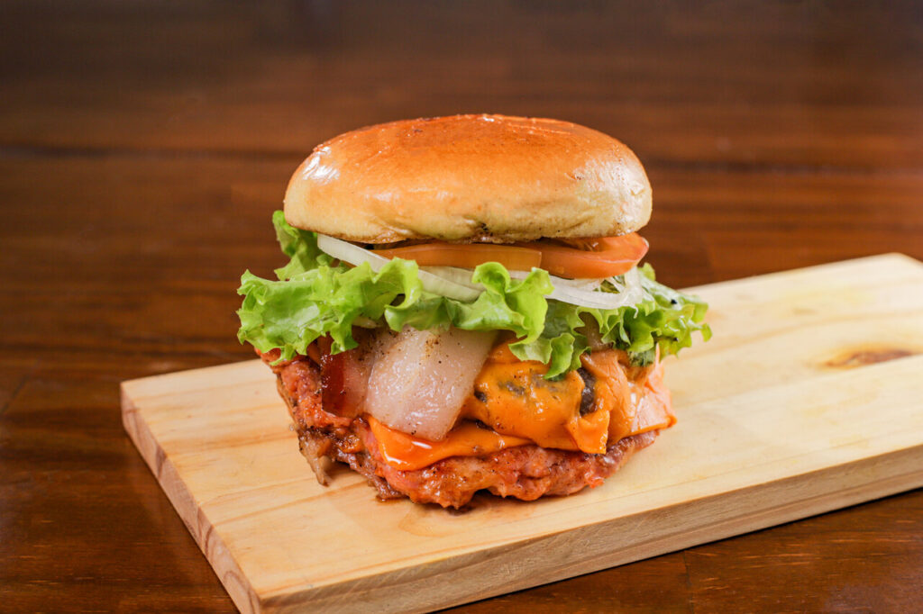 Pão Brioche, Blend de costela bovina 150g mais Blend de linguiça apimentada 150g, duplo cheddar, Duplo bacon, salada de alface e tomate, molho barbecue, batata rústica.