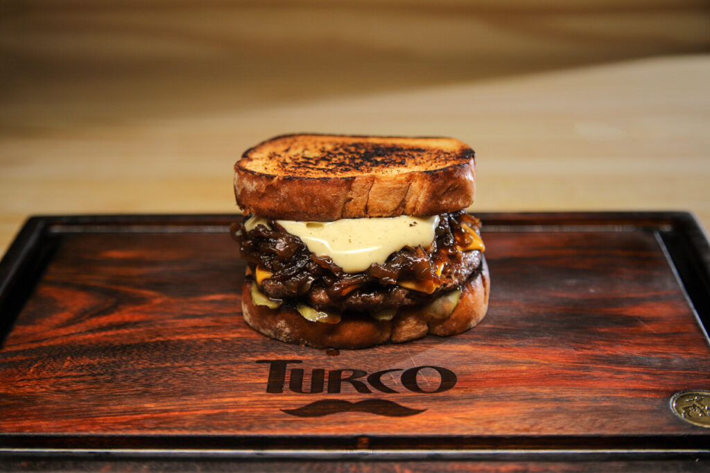 Duas fatias de pães de forma artesano tostadinho dos dois lados, laminas de picles, hambúrguer grelhado e coberto de queijo cheddar, cebola caramelizada e uma maionese a base de mel, que faz o casamento perfeito com a cebola da Turco.. Um absurdo de suculência