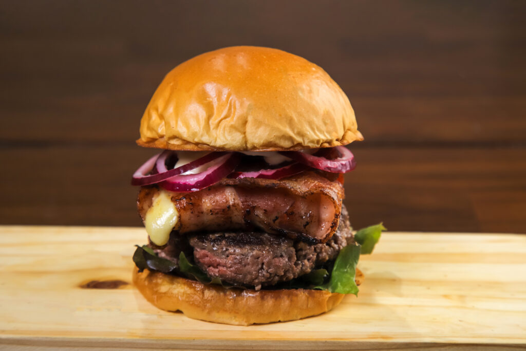 Pão, blend de 170g, queijo meia cura e goiabada na trama de bacon, cebola roxa marinada no limão, alface roxa e maionese defumada de alho